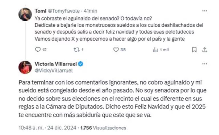 Como suele hacer para evitar un choque directo con el presidente, la titular de la Cámara alta aprovechó una crítica de un usuario de la red X para sentar posición: “Para terminar con los comentarios ignorantes, no cobro aguinaldo y mi sueldo está congelado desde el año pasado. No soy senadora por lo que no decido sobre sus elecciones en el recinto el cual es diferente en sus reglas a la Cámara de Diputados. Dicho esto Feliz Navidad y que el 2025 te encuentre con más sabiduría que este que se va”, fue la frase.