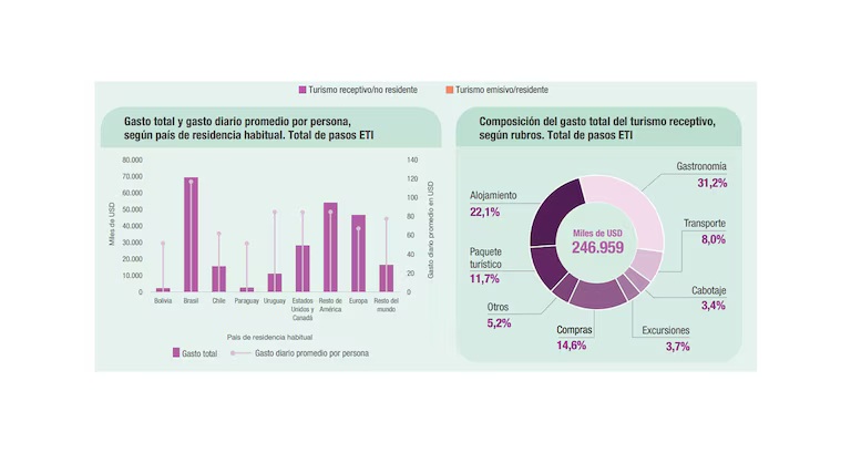 En términos de gasto, el turismo receptivo dejó ingresos por USD 246,9 millones, con mayor incidencia de Brasil (USD 69,4 millones) y Europa (USD 46,7 millones). Los turistas de Estados Unidos y Canadá aportaron USD 28,2 millones, mientras que los de Chile dejaron USD 15,6 millones.