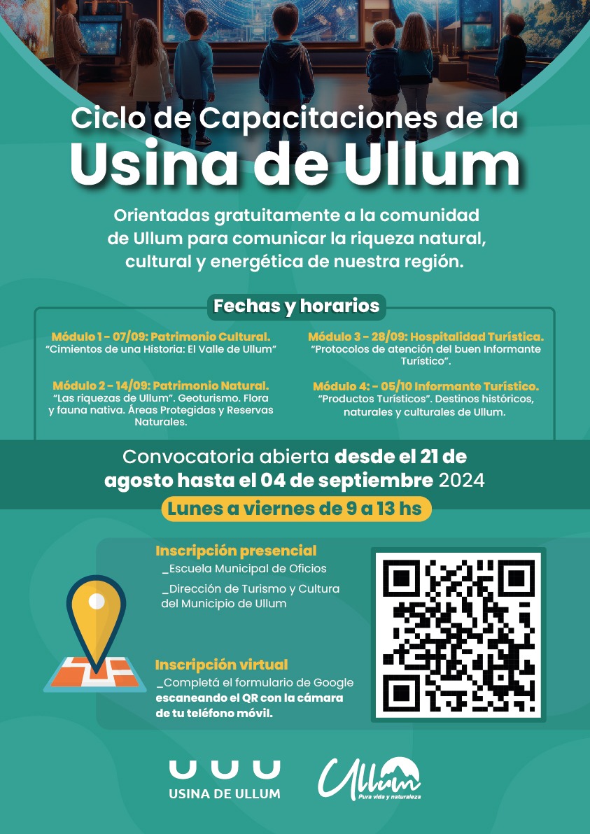 Desde este 20 de agosto se abren las inscripciones al ciclo de capacitaciones gratuitas en materia turística y cultural, organizado por la Municipalidad de Ullum y el proyecto La Usina. Se trata de una actividad gratuita para mayores de 18 años, orientada a la comunidad ullunera para que puedan recibir a los visitantes del departamento con los más altos estándares de hospitalidad, capaces de comunicar de manera efectiva la riqueza natural, cultural y energética de la región.
