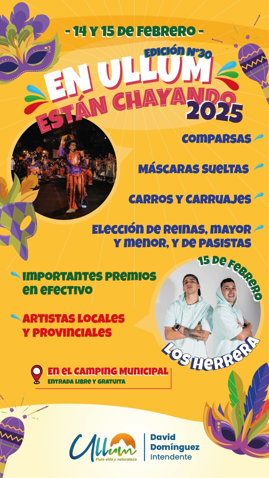 Del 14 al 16 de febrero en Ullum se podrá disfrutar de dos grandes celebraciones con entrada libre y gratuita: los carnavales En Ullum están Chayando y la Fiesta de Ullum y su Espejo.