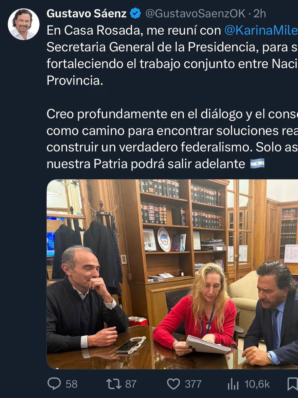 Ayer, Sáenz, un aliado que la semana pasada se desmarcó del gobierno cuando aportó al quórum en una sesión incómoda para el Ejecutivo, viajó hasta Buenos Aires para fotografiarse en Casa Rosada con la hermana del presidente y “Lule” Menem. Una imagen con impacto entre los gobernadores que hizo ruido puertas adentro. “El dato político no es el encuentro, si no quiénes lo recibieron en Casa Rosada”, opinó un operador provincial. ¿Se trató solo de un caso aislado?