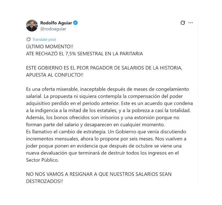 El sindicato también cuestionó el cambio en la modalidad del acuerdo. Por primera vez desde el inicio de la gestión, la oferta se presentó como una propuesta semestral en vez de mensual. “Es llamativo el cambio de estrategia. Un Gobierno que venía discutiendo incrementos mensuales, ahora lo propone por seis meses. Nos vuelven a joder porque ponen en evidencia que después de octubre se viene una nueva devaluación que terminará de destruir todos los ingresos en el Sector Público. Si tenemos en cuenta la inflación proyectada a diciembre, incluso sin un corrimiento del tipo de cambio, esta propuesta semestral es menos de la mitad”, remarcó Aguiar.
