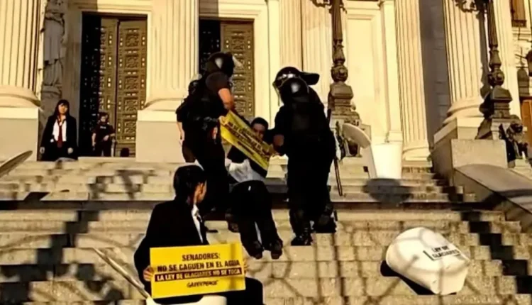 Un grupo de activistas de Greenpeace fue detenido en la explanada del Congreso de la Nación, durante una manifestación contra el proyecto de reforma de la Ley de Glaciares que el oficialismo busca aprobar en el Senado.