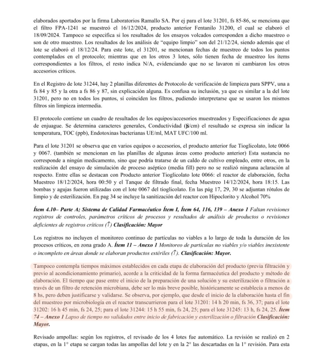 4. “La operatoria de filtrado resulta crítica ya que un tiempo excesivo puede afectar la esterilidad y la calidad del inyectable. El tiempo que pase entre el inicio de la preparación de una solución y su esterilización o filtración a través de un filtro de retención bacteriana, debe ser los más breve posible, históricamente se establecía a menos de 8 horas, pero deben justificarse y validarse. Se observa, por ejemplo, que desde el inicio de la elaboración hasta el fin del muestreo por microbiología en el reactor trascurrieron para el lote 31201: 14 horas y 20 minutos; para el lote 31202 (vinculado a la mayor cantidad de víctimas) 16 horas y 45 minutos”. El informe aclara que ese es un “lapso de tiempo no validados entre el inicio de fabricación esterilización o filtración”. La clasificación del desvío de calidad fue clasificada como “mayor”.