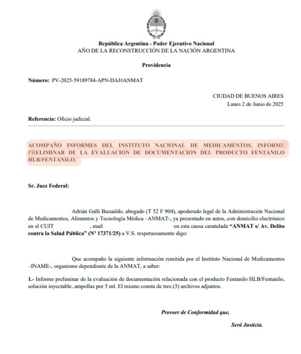 “Acompaño la siguiente información remitida por el Instituto Nacional de Medicamentos –INAME-, organismo dependiente de la ANMAT, a saber: 1.- Informe preliminar de la evaluación de documentación relacionada con el producto Fentanilo HLB/Fentanilo, solución inyectable, ampollas por 5 ml”. Comienza el documento oficial al que accedió este medio.