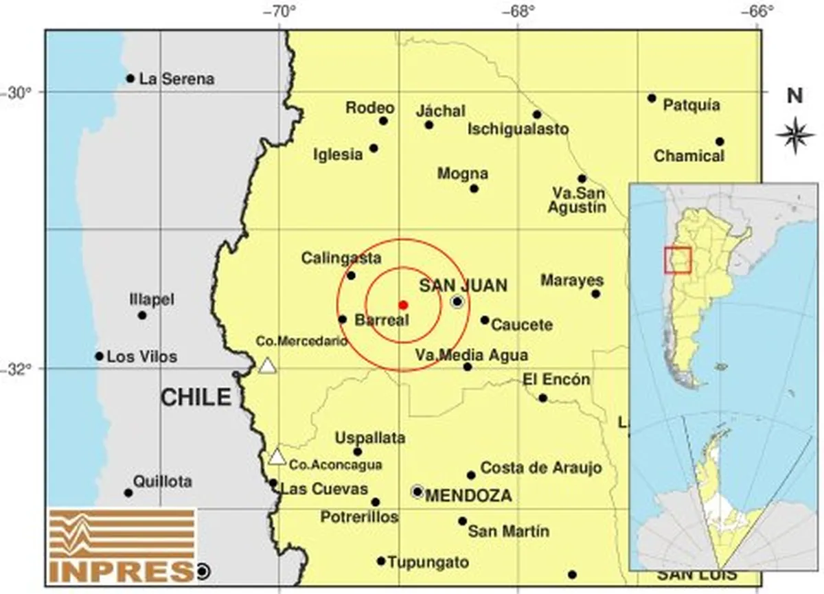 De acuerdo a los datos suministrados por el INPRES, el epicentro también se ubicó a 49 kilómetros al sureste de Calingasta y a 56 kilómetros al noreste de Barreal. Vecinos de distintos departamentos señalaron haber sentido el movimiento, aunque sin consecuencias mayores.