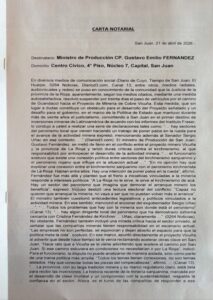 La carta documento fue presentada en el Centro Cívico y recepcionada por el área administrativa del ministerio, luego de que no se concretara su entrega directa en el despacho del funcionario. El episodio se suma a una serie de cruces políticos en torno a la minería, uno de los temas centrales en la agenda económica de San Juan.