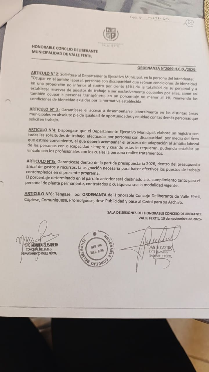 Valle Fértil Promulga Ordenanza Histórica de Cupo Laboral para Personas con Discapacidad y Trans