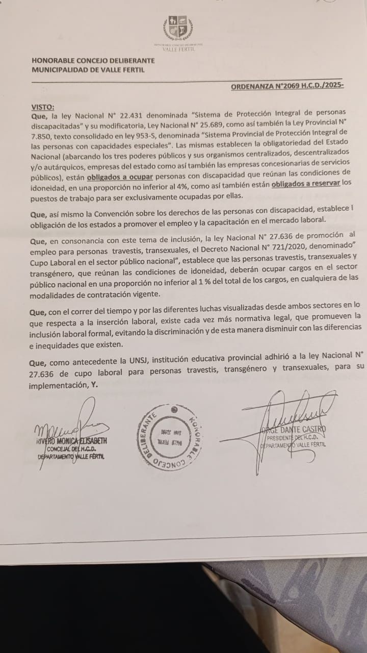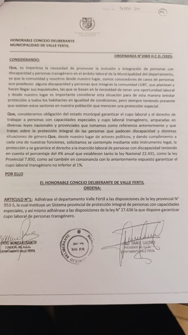 Valle Fértil Promulga Ordenanza Histórica de Cupo Laboral para Personas con Discapacidad y Trans