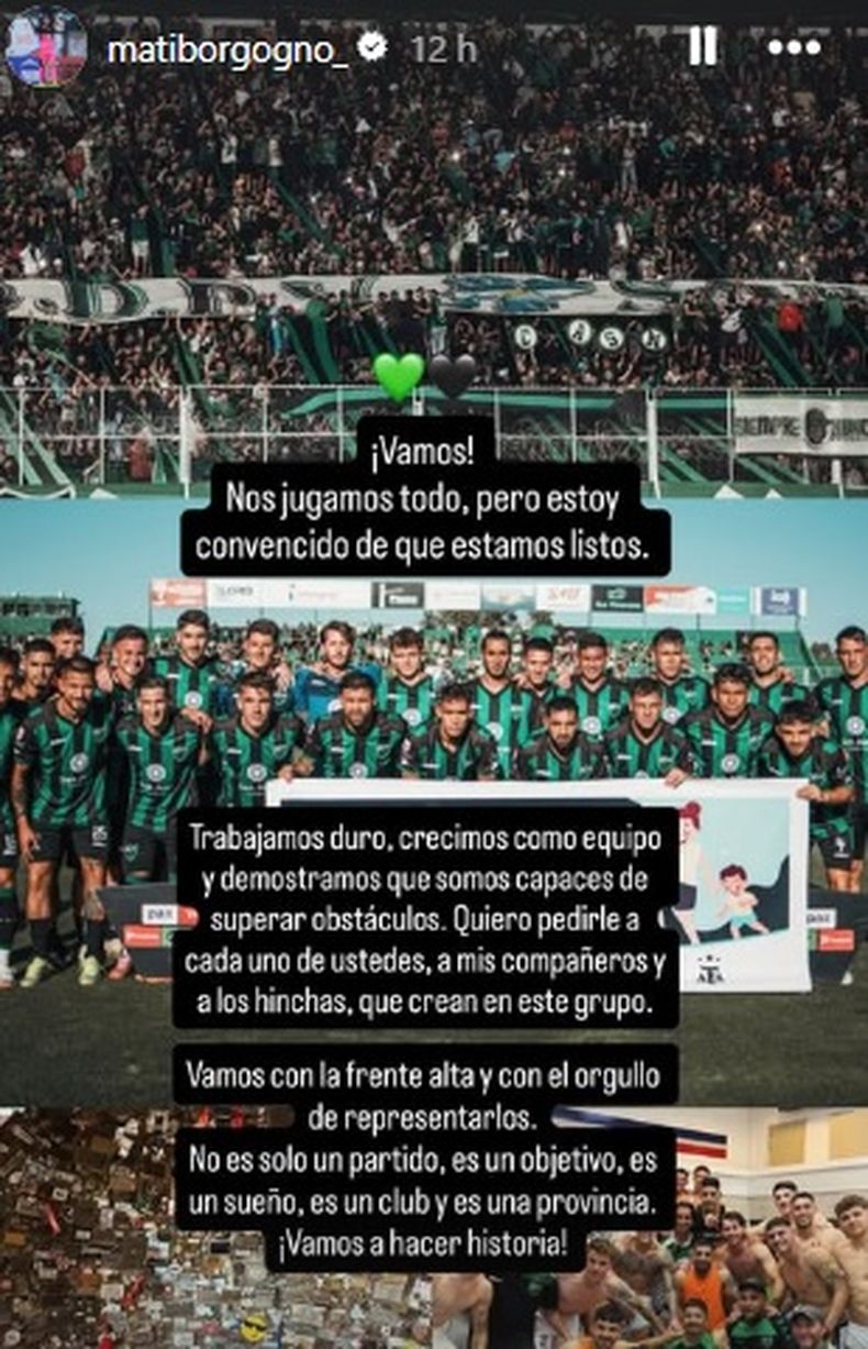 “Vamos con la frente alta y con el orgullo de representarlos. No es solo un partido, es un objetivo, es un sueño, es un club y es una provincia. ¡Vamos a hacer historia!”, agregó el arquero.