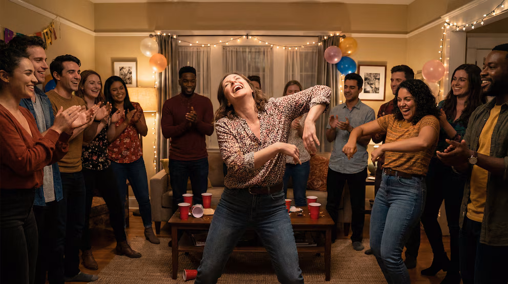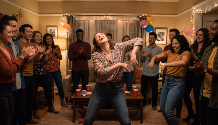 Un grupo diverso de jóvenes celebra en una fiesta, con una mujer en el centro bailando animadamente mientras sus amigos la rodean, aplauden y ríen. Hay globos y luces decorativas.Las mujeres encuentran mayor facilidad y seguridad para sumarse a propuestas grupales, mientras que los hombres muestran mayor reticencia (Imagen Ilustrativa Infobae)