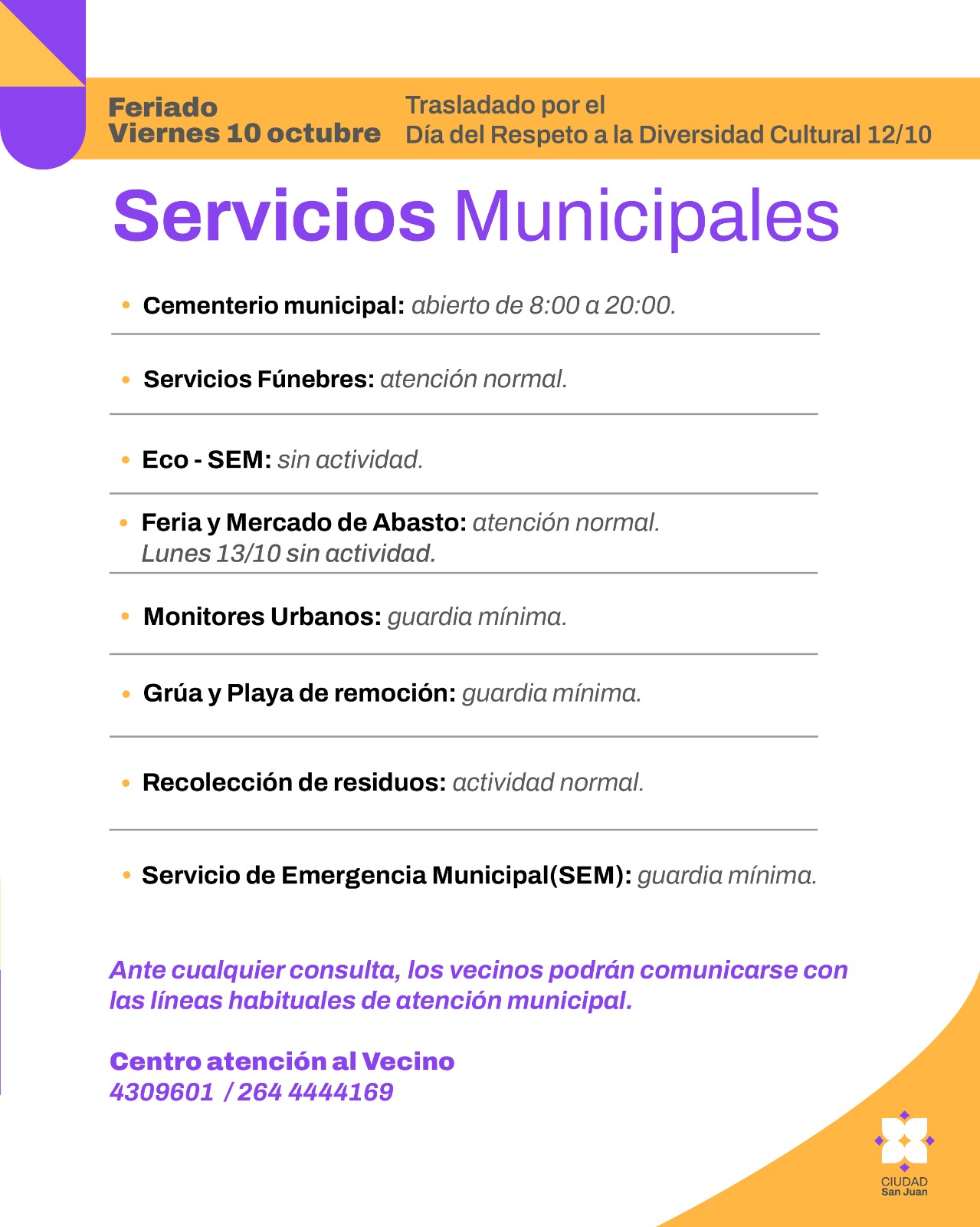 El feriado correspondiente al Día de la Raza, que tradicionalmente se conmemora el 12 de octubre, este año se trasladó al viernes 10 de octubre en todo el territorio nacional. Por ello, la Municipalidad de la Ciudad de San Juan adecuará el funcionamiento de sus servicios, priorizando el acceso de a las prestaciones esenciales y garantizando el orden en el espacio público.