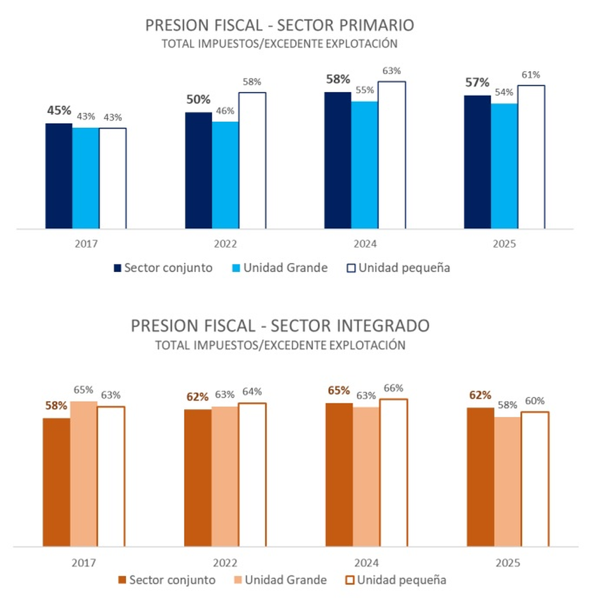 Esta presión sube al 61,2%, si es una finca pequeña, o baja al 53,6%, si se trata de una finca grande; mientras que en el caso de una bodega pequeña se ubica en el 63,4% y en el 58,4% si es grande, destaca el informe.