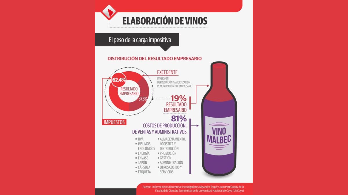 Otra forma de ver el peso de los impuestos es tomar el ejemplo de una bodega en Mendoza que tiene producción propia de uvas para vinificar.