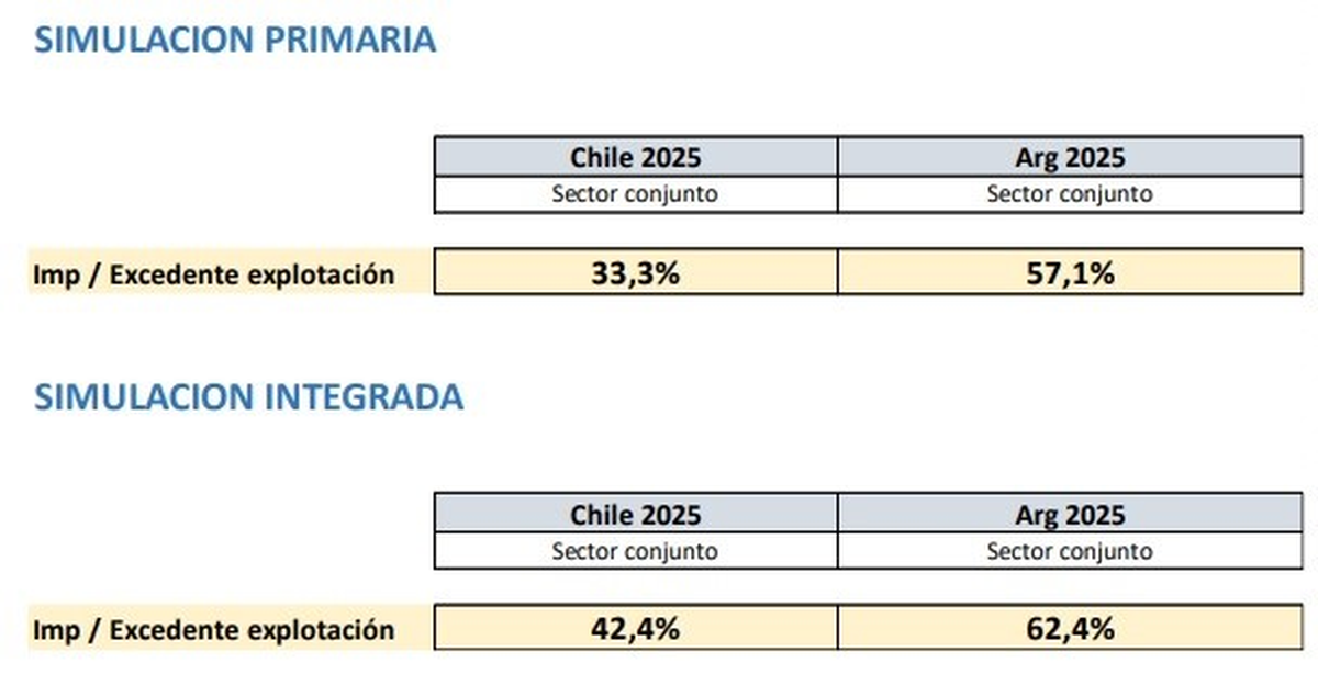 Puntualmente en Chile, mientras los impuestos que en promedio paga una finca se llevan el 33,3% del excedente puro de explotación, en Argentina representan el 57,1%. Mientras que, para una bodega, en Chile los impuestos toman el 42,4% del excedente puro cuando en Argentina son el 62,4%.