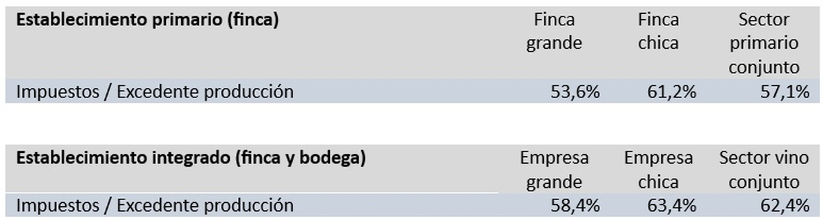 Que el pago de impuestos en la vitivinicultura se lleve en Argentina el 57,1% del excedente de explotación de una finca o el 62,4% del mismo excedente de una bodega son valores altos incluso para la economía nacional y mayor al del promedio de la economía de países de la región.