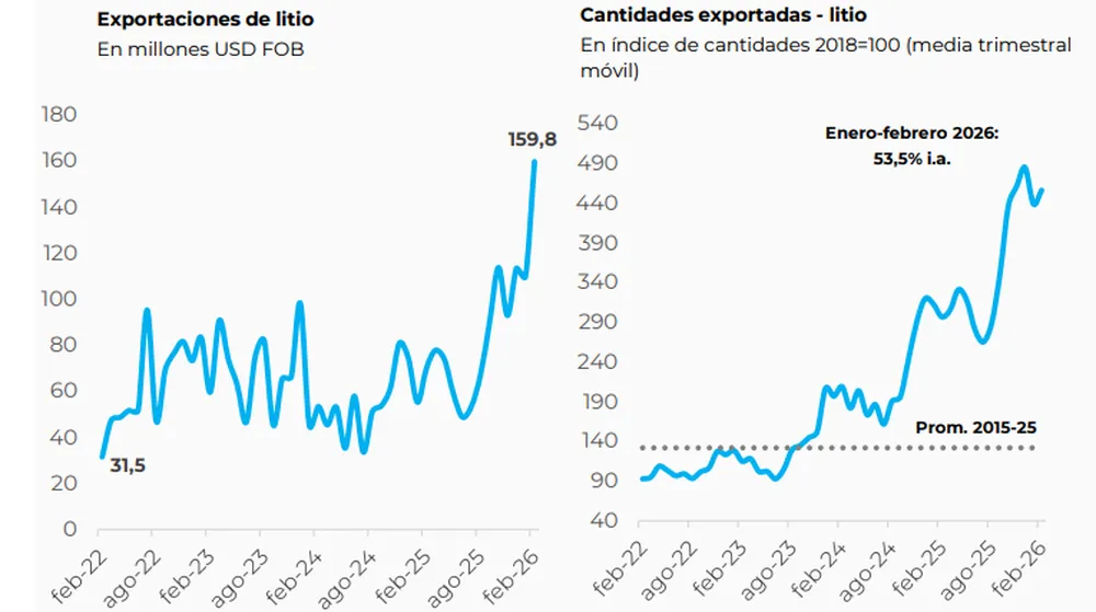 El litio se consolidó como el segundo producto más importante del sector. En febrero, las exportaciones alcanzaron 160 millones de dólares, con un crecimiento interanual del 128,5%, marcando un récord histórico para ese mes. Este desempeño se explica tanto por el aumento de precios como por una mayor cantidad exportada.