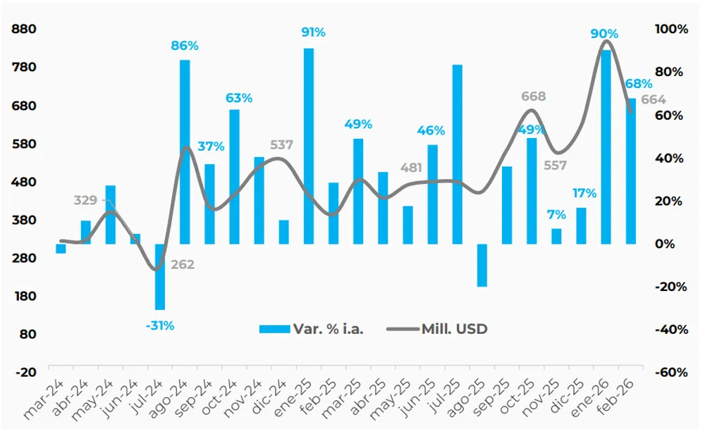 Este desempeño representa un crecimiento interanual del 67,9% en febrero y del 79,9% en el acumulado de enero y febrero. Además, el nivel alcanzado se ubica un 157,1% por encima del promedio registrado entre 2010 y 2025 para los mismos meses, consolidando una tendencia de expansión sostenida en el sector.
