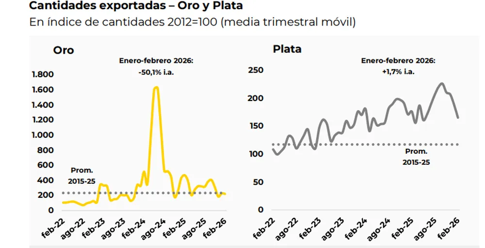 El oro mostró un crecimiento interanual del 76,6%, impulsado principalmente por el aumento de los precios internacionales. En contraste, la plata registró una caída del 20,1% en febrero, explicada por una fuerte disminución en los volúmenes exportados, que retrocedieron un 66%.