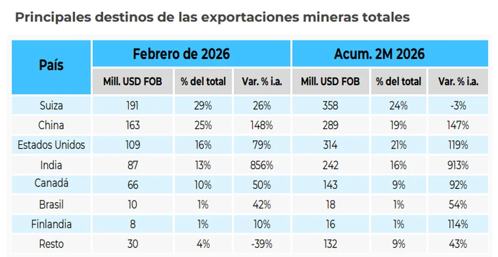 En cuanto a los destinos de exportación, cuatro países concentraron la mayor parte de las ventas: Suiza, China, Estados Unidos e India. En conjunto, representaron el 83% de las exportaciones mineras en febrero y el 80% en el acumulado del primer bimestre.