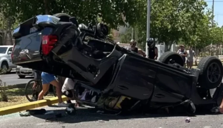 Una Toyota Hilux perdió el control, chocó contra el boulevard y terminó volcada en Marquesado, Rivadavia. A pesar del violento impacto, no hubo heridos de gravedad, aunque los daños materiales fueron importantes.